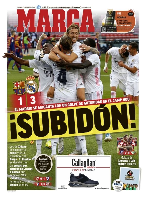 En la vereda de enfrente, los diarios madrileños destacaron el triunfo del equipo de Zinedine Zidane y apenas hicieron mención al beneficio con el que cuentan los Merengues prácticamente en todos los partidos. "¡Subidón", tituló Marca, asegurando que "el Madrid se agiganta con un golpe de autoridad en el Camp Nou", dedicándole un pequeñísimo apartado a la queja de Koeman.