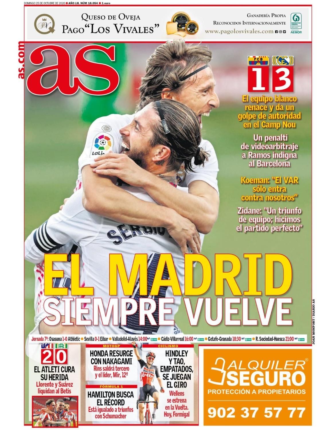 Por su parte el diario As, el otro diario madridista, tituló "el Madrid siempre vuelve" junto a una foto de Luka Modric y Sergio Ramos, dos de los goleadores ayer en el estadio Blaugrana. "El equipo blanco renace y da un golpe de autoridad en el Camp Nou", agregó, también mencionando al pasar la intervención del VAR.