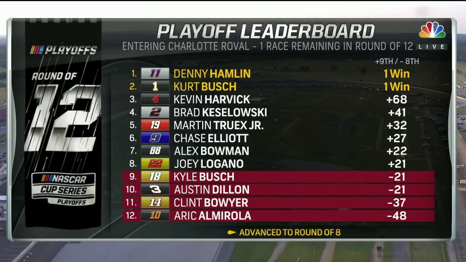 Detrás del nacido en Florida, de 39 años, arribaron Erik Jones (Toyota), Ty Dillon, William Byron (ambos de Chevrolet) y Ryan Newman (Ford), quienes completaron el top 5. A su vez, Joey Logano punteó la mayor cantidad de vueltas hasta que a seis del final apareció la amarilla por un impacto de Bubba Wallace contra el muro.