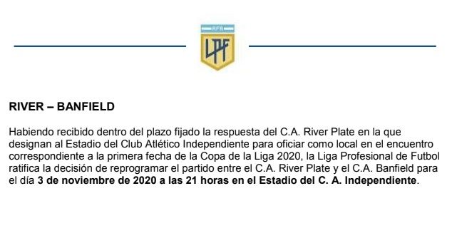 River Plate jugará en el estadio de Independiente durante la Copa de la Liga Profesional de Fútbol (LPF), aunque lo hará "bajo protesta" luego de que este organismo le prohibiera hacerlo en el River Camp, según se desprende del comunicado que le envió esta noche, minutos antes de las 20, que era el plazo estipulado para que confirmara el escenario del cotejo del próximo martes a las 21 ante Banfield.
