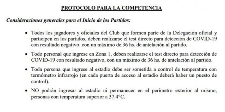 Según lo publicado en el Boletín Oficial de 28 de octubre, “todos los jugadores y oficiales del Club que formen parte de la Delegación oficial y participen en los partidos, deben realizarse el test directo para detección de COVID-19 con resultado negativo, con un máximo de 36 hs. de antelación al partido”.