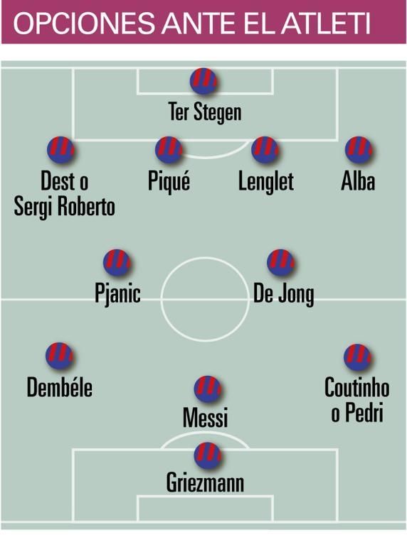 En defensa, una única duda en el papel de Dest, si será o no titular en el lateral derecho. En los dos últimos partidos, frente al Dinamo y ante el Betis, Koeman le dejó en el banquillo recurriendo a Sergi Roberto.