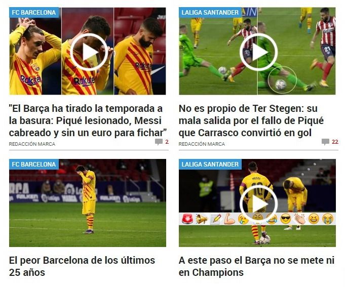 Marca, de Madrid, fue el más duro contra el conjunto Culé, como es habitual. Además de hacer hincapié en los dichos de Koeman, aseguró en una de sus notas que "el Barça ha tirado la temporada a la basura", destacando la lesión de Piqué, el hartazgo de Messi y la mala situación económica que no le permitirá fichar refuerzos de renombre.