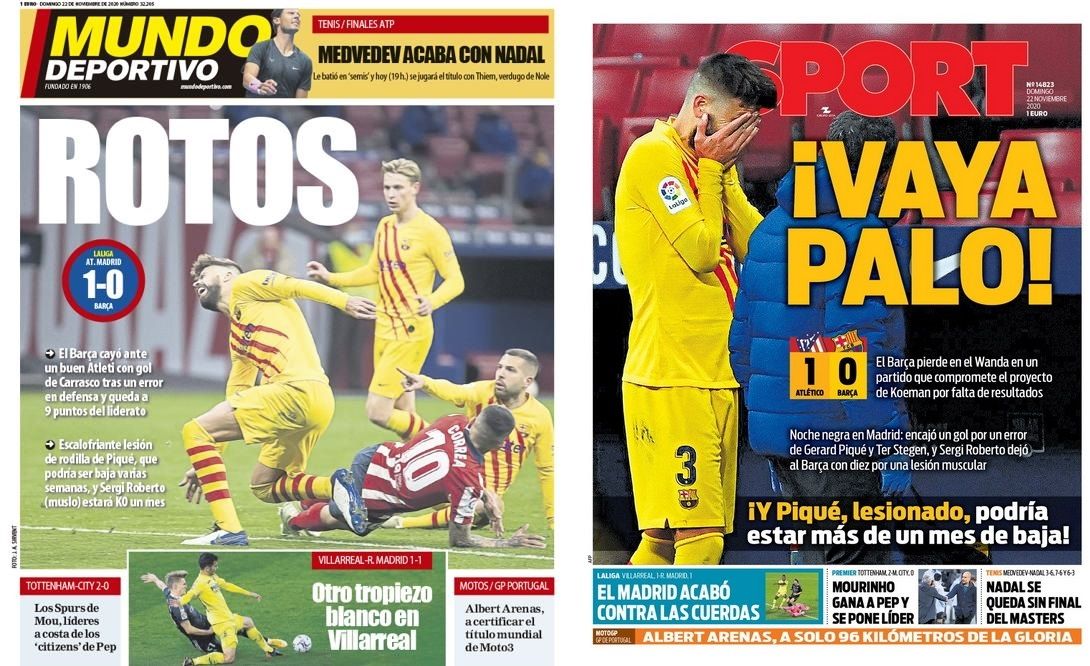 Por su parte, en Cataluña se centraron en la lesión de Piqué e hicieron un juego de palabras asegurando que el equipo está "roto" como terminó el defensor. "Rotos", fue el título de portada de Mundo Deportivo, mientras que Sport tituló "vaya palo", asegurando que la derrota "compromete el proyecto de Koeman por falta de resultados".
