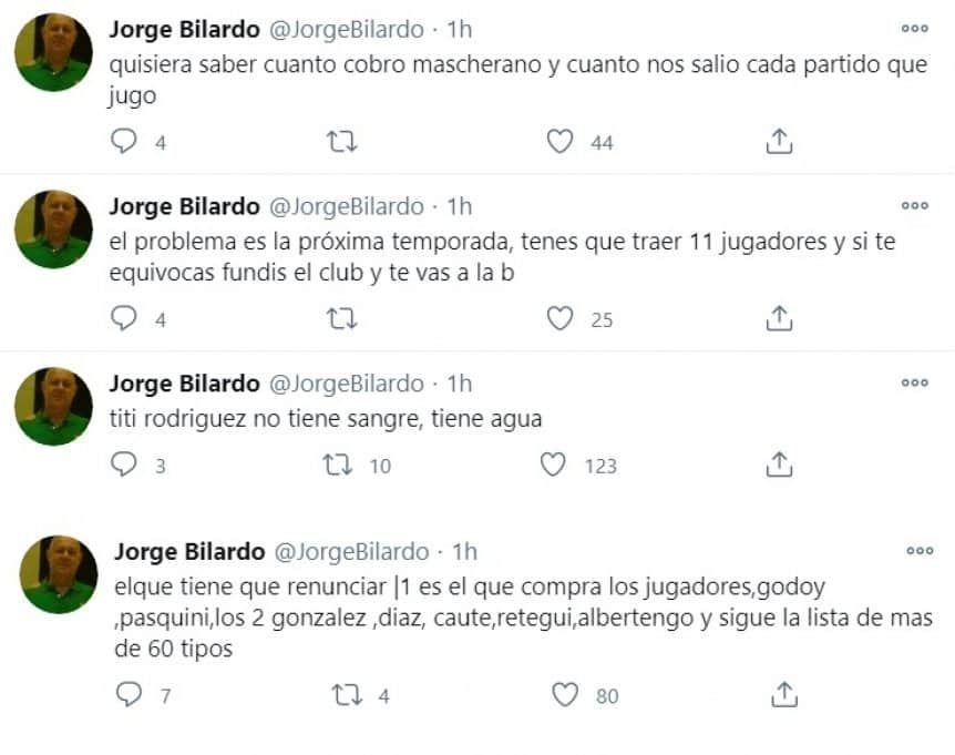 Según informa TyC Sports, Jorge Bilardo escribió lo siguiente: "Quisiera saber cuánto cobró Mascherano y cuánto nos salió cada partido que jugó". Además vislumbró un futuro complicado para Estudiantes: "El problema es la próxima temporada, tenés que traer 11 jugadores y si te equivocas fundís el club y te vas a la B", agregó.