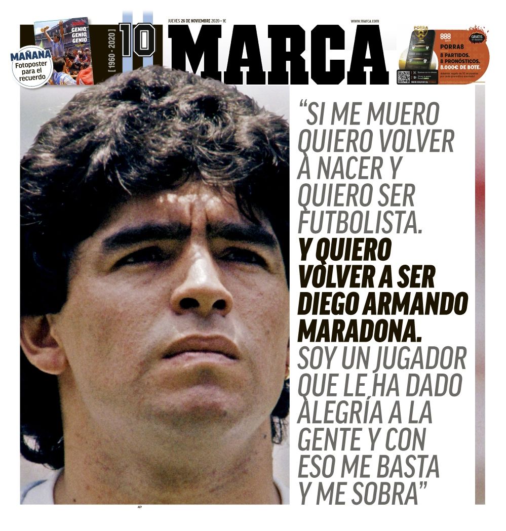 Su imponente titular la coloca como la portada más impactante de las cientos que recorren el mundo. Marca, de España, optó por una publicación con una sentida frase expresada por el "10": Si me muero quiero volver a nacer y quiero ser futbolista. Y quiero volver a ser Diego Armando Maradona. Soy un jugador que le ha dado alegría a la gente y con eso me basta y me sobra".