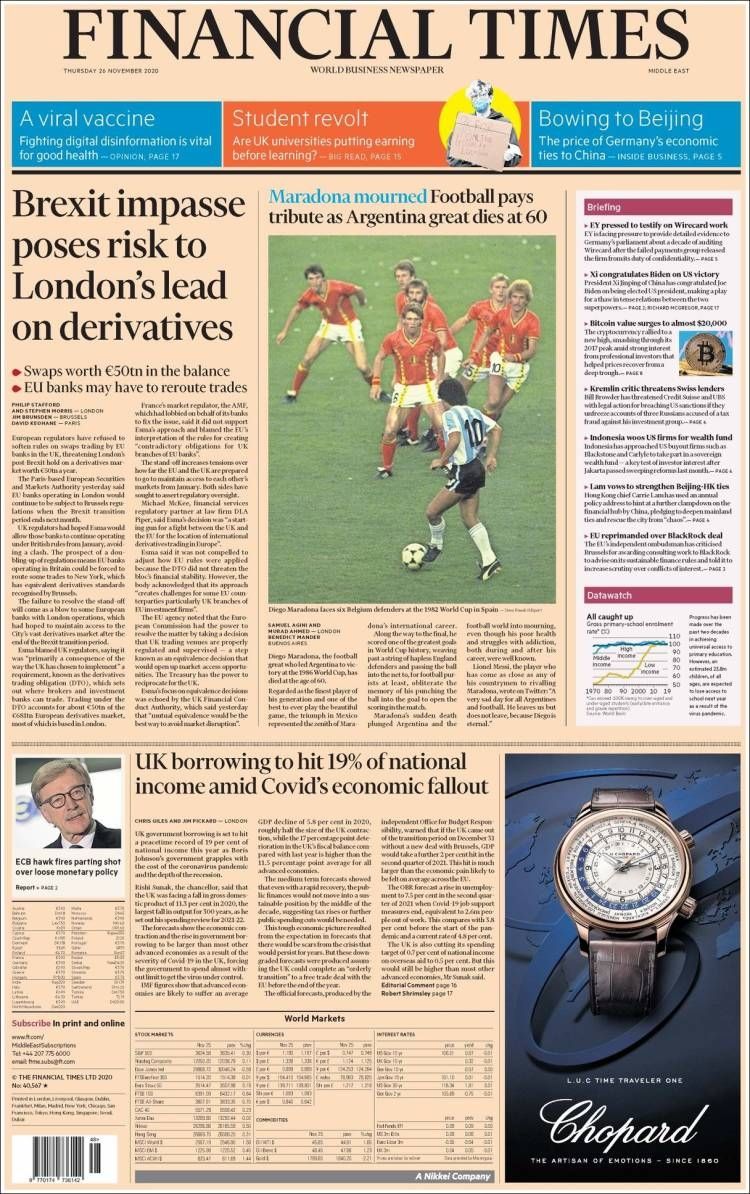 Otro de los diarios que llamó la atención poniendo a Maradona en su tapa fue el Financial Times, por tratarse de un diario económico y de negocios. "Lamento por Maradona. El fútbol rinde tributo ante la muerte del gran argentino a los 60", tituló.