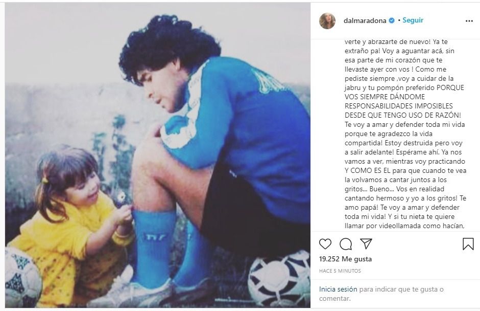 Luego del entierro de Diego Armando Maradona, su hija mayor, Dalma, reapareció en las redes sociales con un conmovedor mensaje publicado en Instagram y una tierna foto de su época en Napoli, en la que se ve al 10 sentado en la pelota y a su pequeña hija poniéndole flores en las medias, una de las imágenes preferidas de los maradonianos.
