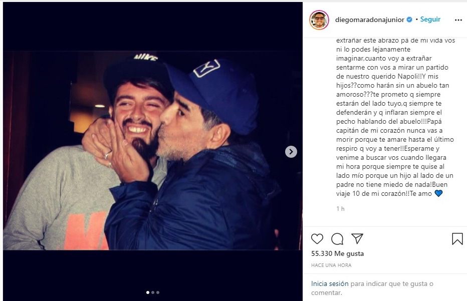 "Cuánto fui feliz con vos, ni lo podías imaginar, sólo mirándote al lado mío me sentía invencible!!!", comenzó escribiendo el hijo de Cristiana Sinagra, agregando además: "Cuánto voy a extrañar ese abrazo, pa de mi vida, vos ni lo podés lejanamente imaginar, cuánto voy a extrañar sentarme con vos a mirar un partido de nuestro querido Napoli!!".