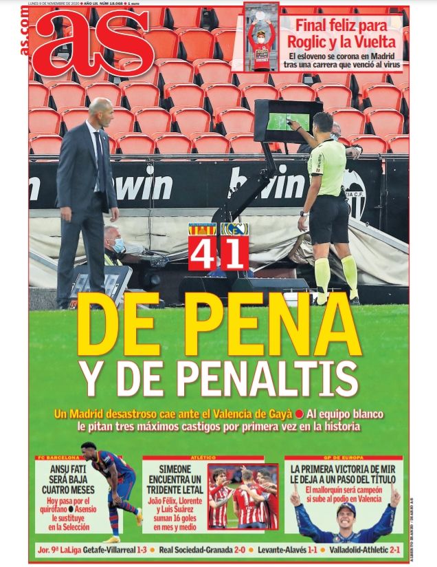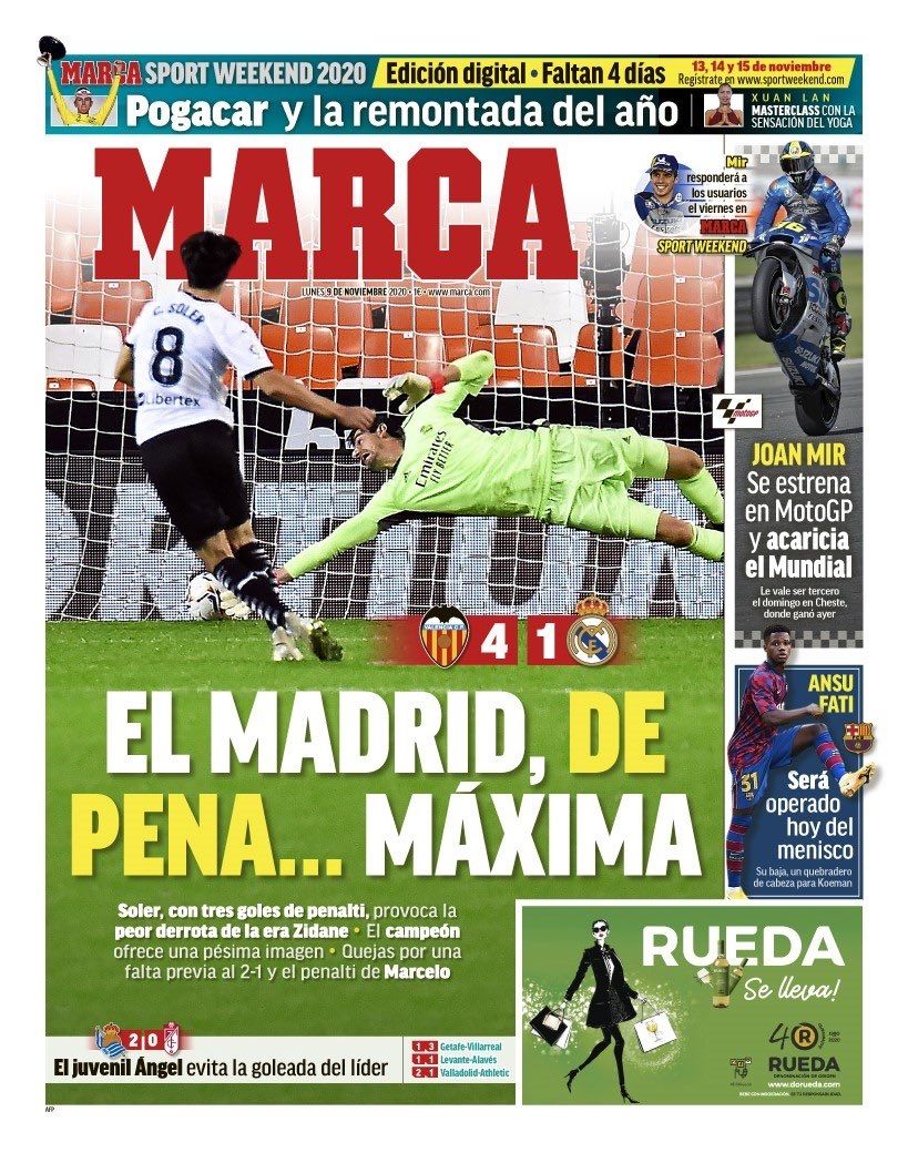 Por su parte, el diario As califica las rotaciones de Zidane de "suicidas". Y recuerda que "el Cádiz advirtió, el Shakhtar golpeó y el Valencia asestó el puñetazo final".