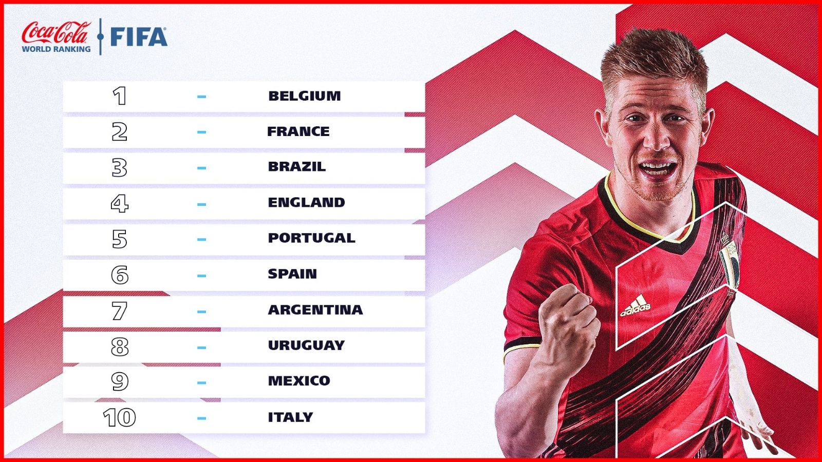 En el segundo puesto se ubica el vigente campeón del mundo, Francia, mientras que Brasil es el único sudamericano en el podio, ocupando el tercer puesto. El otro sudamericano que integra es el Top 10 es Uruguay, un escalón por debajo de la Argentina.