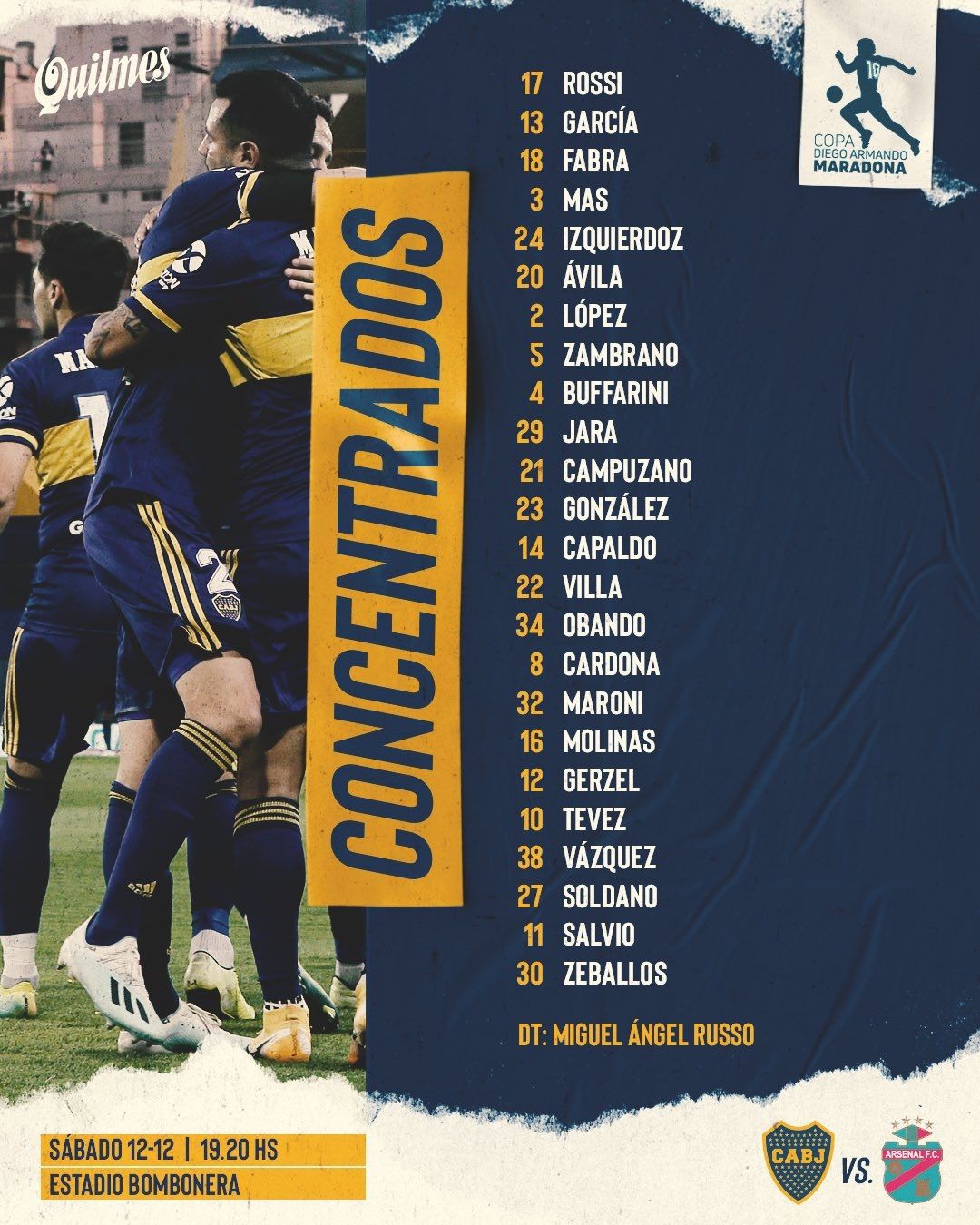 Boca Juniors recibirá este sábado a Arsenal en la Bombonera en la primera fecha de la Fase Campeonato de la Copa Diego Maradona. Para este partido, Miguel Ángel Russo dejó afuera de los convocados a Mauro Zárate.