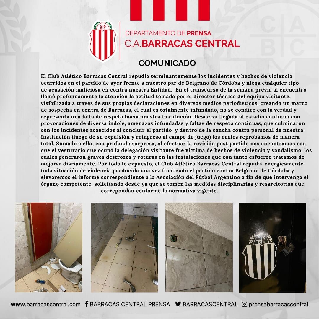 "Por lo expuesto, el club Barracas repudia enérgicamente toda la situación de violencia y elevará un informe a la Asociación del Fútbol Argentino a fin de que intervenga el órgano competente, solicitando que se tomen las medidas disciplinarias y resarcitorias que corresponden", concluye.