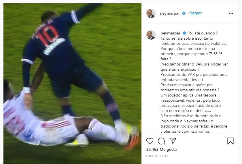 Neymar Santos, padre de Neymar Junior, quien se tuvo que retirar este domingo lesionado en el partido entre el PSG y el Lyon tras una dura entrada de su compatriota Thiago Mendes, estalló contra la dureza que sufre su hijo.