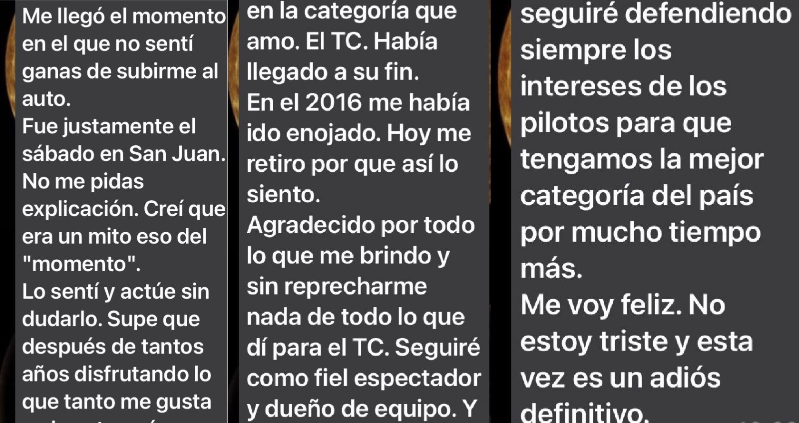 "Creí que era un mito eso del “momento”. Lo sentí y actúe sin dudarlo. Supe que después de tantos años disfrutando lo que tanto me gusta, en la categoría que amo, el TC, había llegado a su fin”, escribió en las redes sociales.