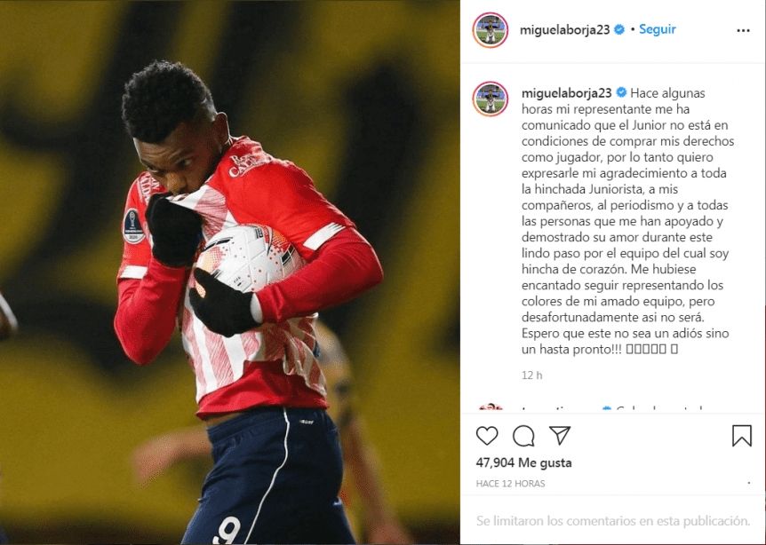 “Hace algunas horas mi representante me ha comunicado que el Junior no está en condiciones de comprar mis derechos como jugador, por lo tanto quiero expresarle mi agradecimiento a toda la hinchada Juniorista, a mis compañeros, al periodismo y a todas las personas que me han apoyado y demostrado su amor durante este lindo paso por el equipo del cual soy hincha de corazón. Me hubiese encantado seguir representando los colores de mi amado equipo, pero desafortunadamente así no será. Espero que este no sea un adiós sino un hasta pronto!!!", escribió Borja en sus redes sociales.