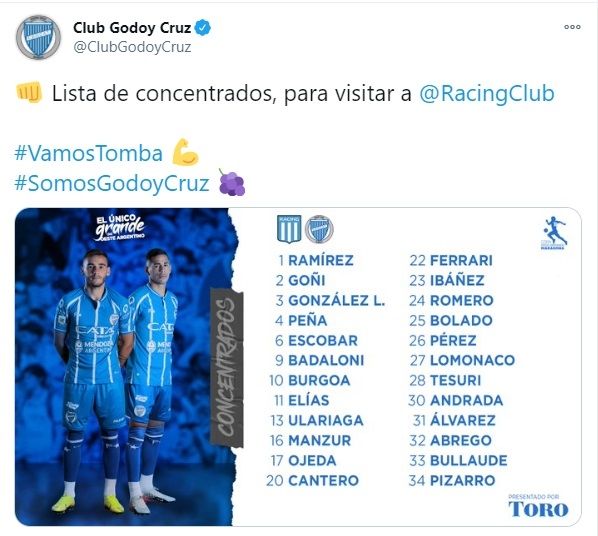 Godoy Cruz, luego de Navidad, tendrá una semana con mucha acción. El domingo, desde las 17.10, visitará a Racing por la Copa Diego Maradona y el miércoles debutará en la Copa Argentina con JJ Urquiza en el estadio de Arsenal. Como ambos encuentros se jugarán en Buenos Aires, Diego Martínez convocó a 24 futbolistas pero no incluyó a Santiago García.
