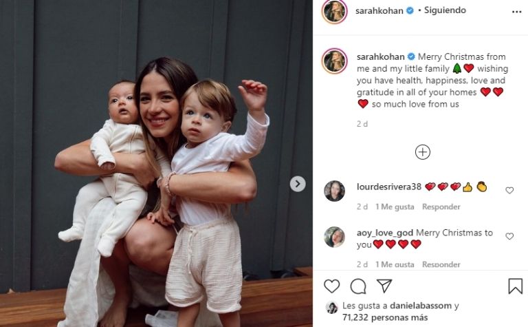 En la primera fotografía, la actriz sostiene a la pequeña Nala en brazos y tiene a Noah tomado de la mano, y está acompañada del texto: “Merry Christmas from me and my little family”.