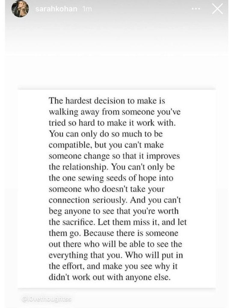 Y un día después, publicó una historia con una contundente frase: “La decisión más difícil de tomar es alejarse de alguien con quien has intentado trabajar con mucho empeño. Sólo puedes hacer ciertas cosas para ser compatible, pero no puedes cambiar a alguien para mejorar la relación (...) Déjalo extrañarte y déjalo ir”.