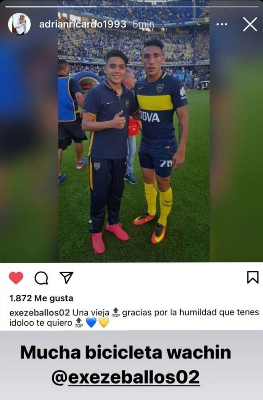 Los elogios para el delantero no tardaron en llegar. Ricardo Centurión aprovechó la oportunidad para compartir en sus historias de Instagram una vieja foto junto a Zeballos, cuando éste era pasapelotas y Ricky era jugador de Boca. "Mucha bicicleta wachin", escribió el actual Vélez, que también conoce de esas.