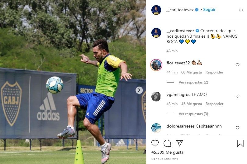 Y, en la previa, Carlos Tevez realizó un posteo que confundió a muchos. El Apache subió un par de fotos a su cuenta de Instagram con la frase: "¡Concentrados que nos quedan tres finales! VAMOS BOCA". Lo curioso es que tanto en el torneo local como en la Copa Libertadores quedan esa cantidad de partidos, aunque la mayoría tomó que va dirigido al certamen continental.