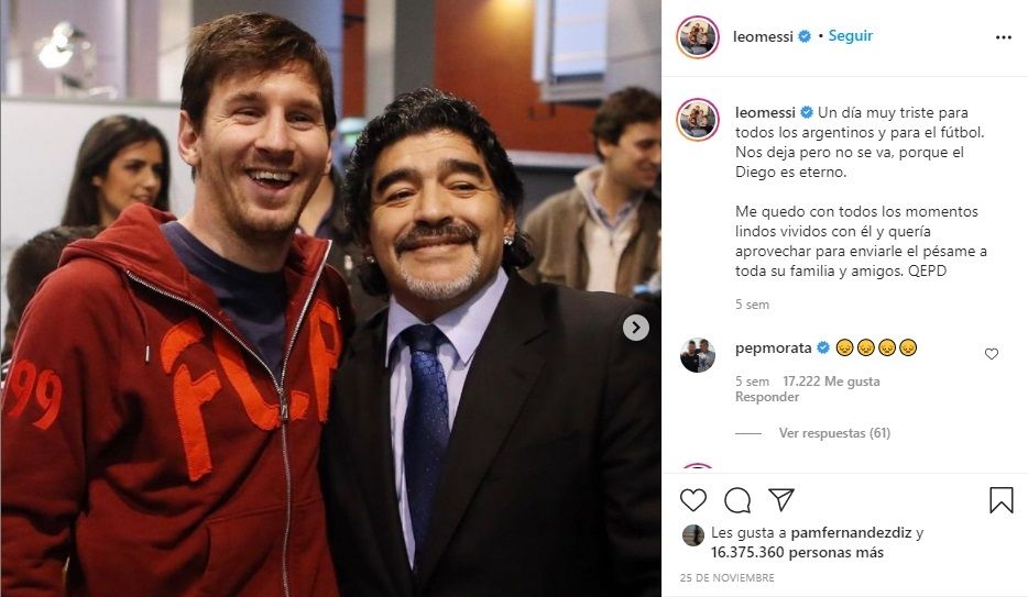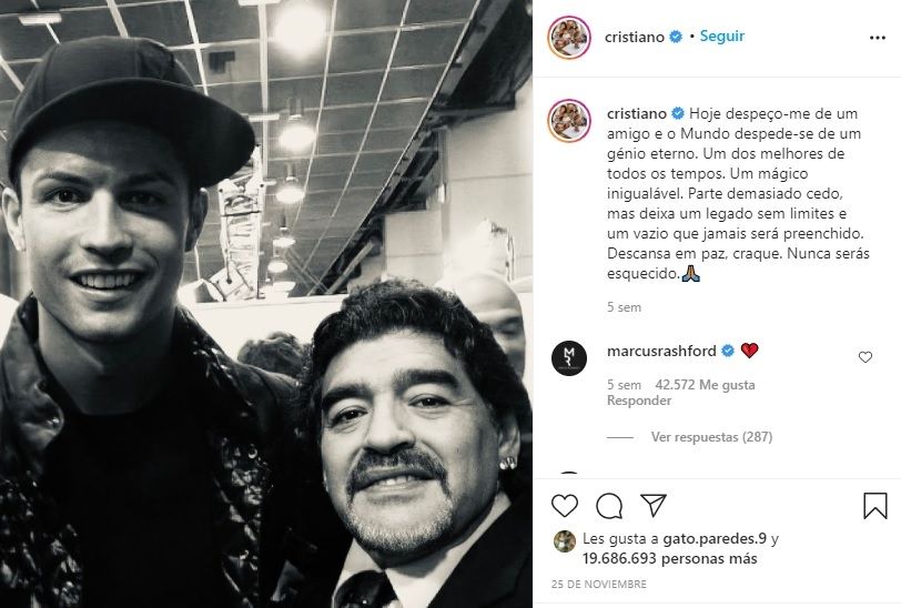 "Hoy me despido de un amigo y el mundo se despide de un genio eterno. Uno de los mejores de todos los tiempos. Un mago incomparable. Se va demasiado pronto, pero deja un legado sin límites y un vacío que nunca se llenará. Descansa en paz. Nunca serás olvidado", escribió el delantero portugués aquel triste 25 de noviembre.