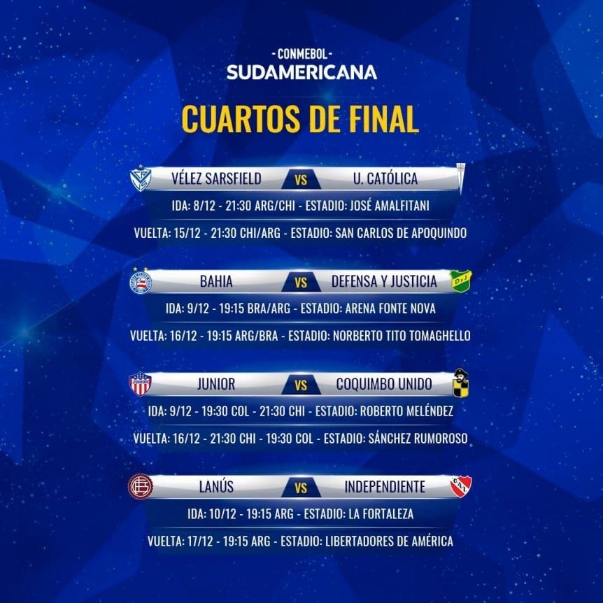 La Conmebol ya confirmó los cronogramas de sus competencias internacionales. La Copa Sudamericana disputará los cuartos de final entre el 8 y el 17 de diciembre. Son cuatro los equipos argentinos que llegaron hasta esta instancia: Independiente, Vélez, Lanús y Defensa y Justicia.