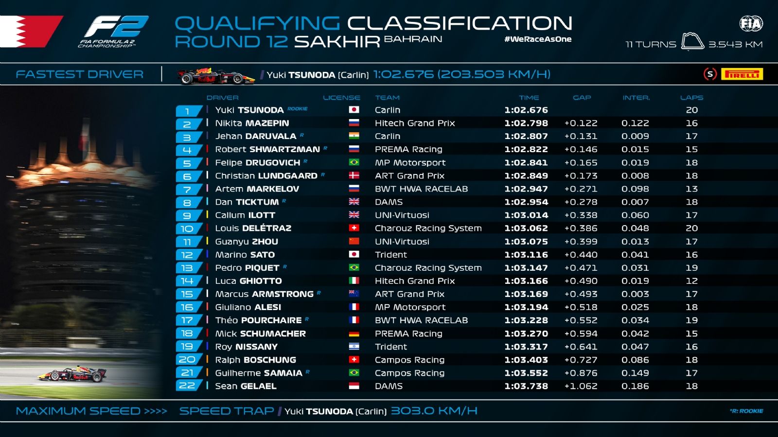 Tres de los 5 aspirantes a la corona saldrán desde las primeras plazas. El alemán tendrá que remontar mucho mañana, ya que su posición determinará como partirá el domingo. Yuki Tsunoda, quinto en el certamen, consiguió la pole y sumó 4 puntos extra. Segundo fue Nikita Mazepin (3ro), ante Jehan Daruvala y Robert Shwartzman (4to).