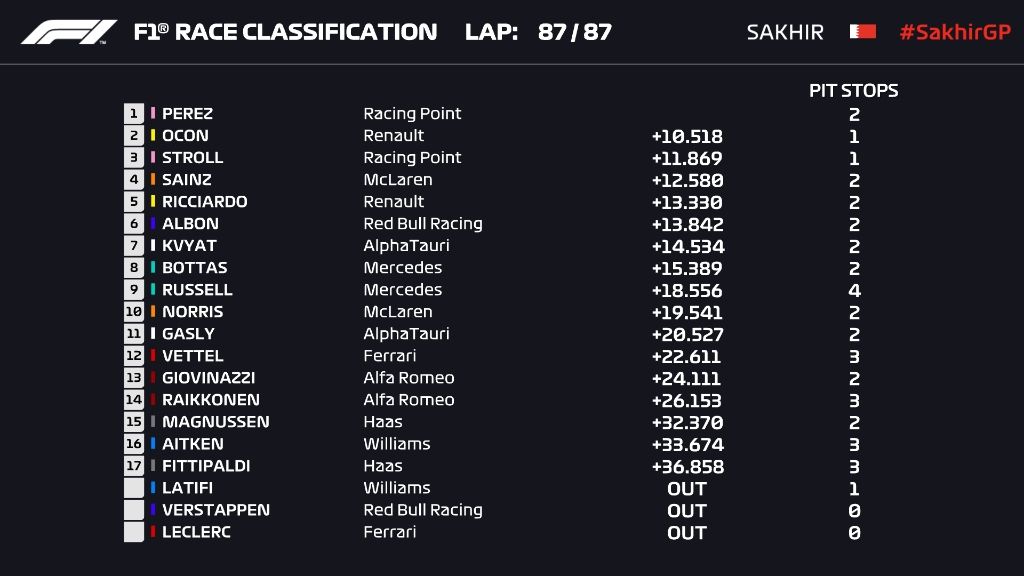 El top 10 de la carrera quedó conformado así: Perez, Ocon, Stroll, Sainz, Ricciardo, Albon, Kvyat, Bottas, Russell, Norris.