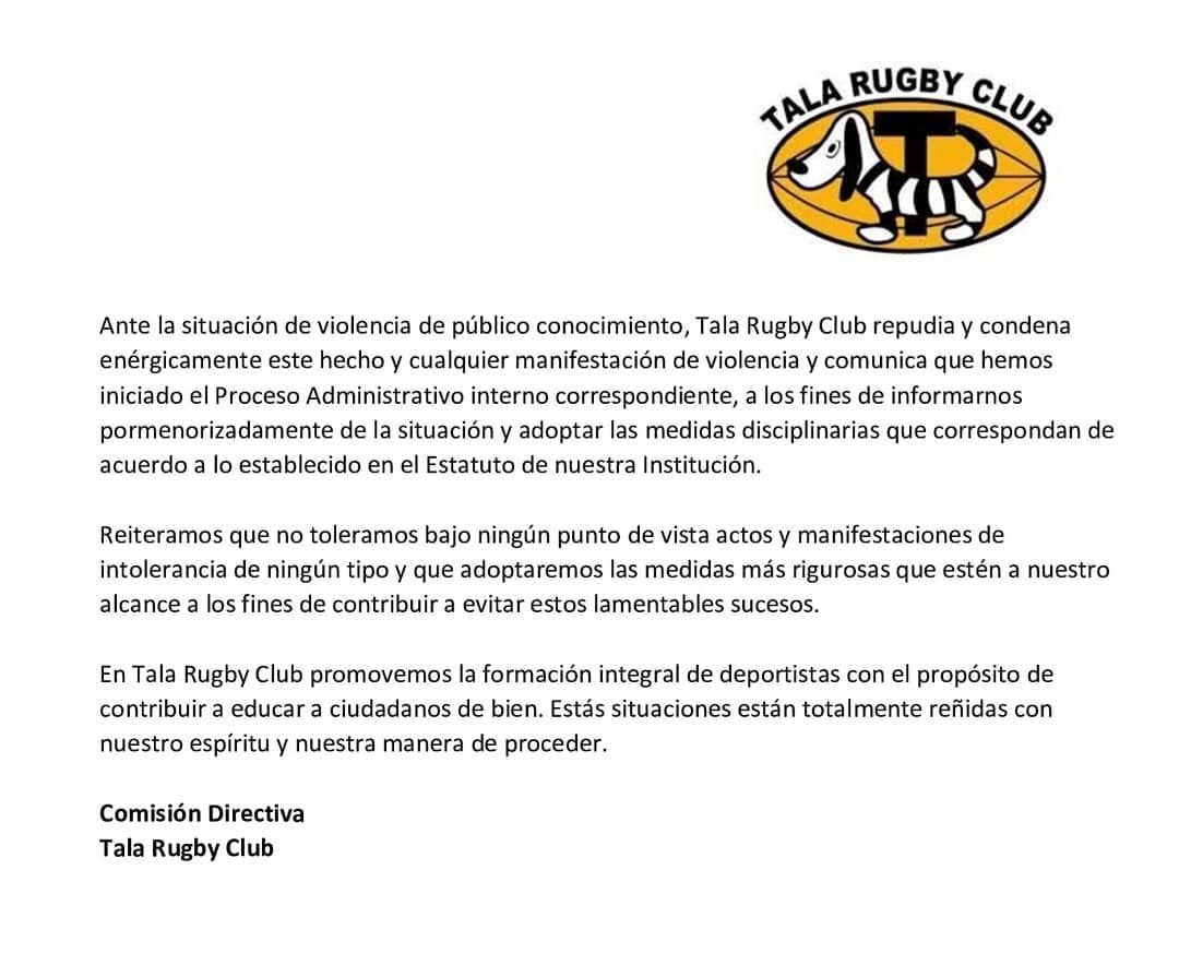 Cuando el hecho tomó trascendencia pública, el club Tala emitió un comunicado en el que informó que "repudia y condena enérgicamente este hecho" y que ya inició el "proceso administrativo interno correspondiente" a los fines de "adoptar las medidas disciplinarias que correspondan".