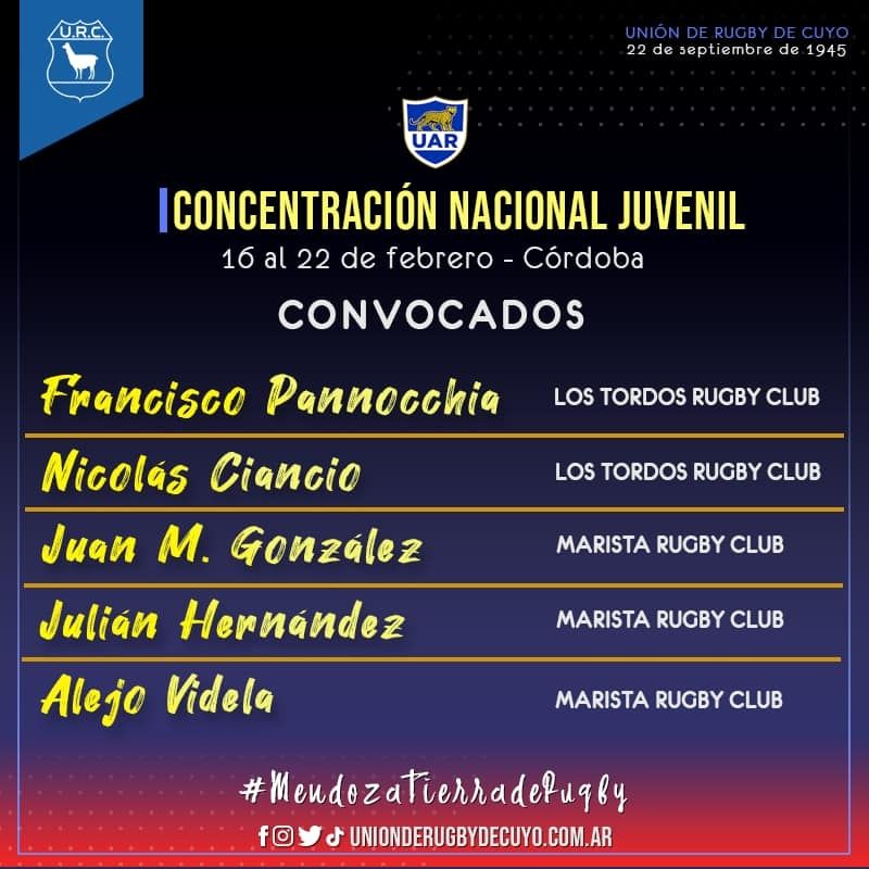 Cinco rugbiers mendocinos han sido convocados para la Concentración Nacional en la ciudad de Córdoba a partir del 16 hasta el 22 de este mes. La UAR suele hacer este tipo de concentraciones y amistosos de preparación para el Mundial M-20 que se jugará en Italia en el mes de junio.