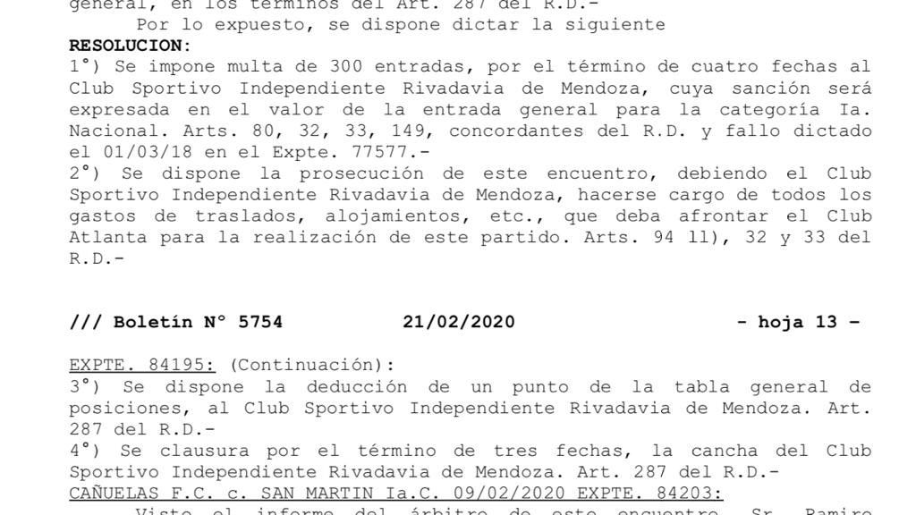 La Asociación del Fútbol Argentino, en su resolución tras los hechos de violencia ocurridos en el estadio Bautista Gargantini en el encuentro correspondiente a la 16ª fecha de la Primera Nacional ante Atlanta, determinó una multa de 1200 entradas divididas en cuatro fechas, más la suspensión del estadio por el término de tres partido, además de la quita de 1 punto y la obligación de percibir todos los costos necesarios de logística del plantel de Atlanta (casi 1 millón de pesos) para la reanudación del encuentro.