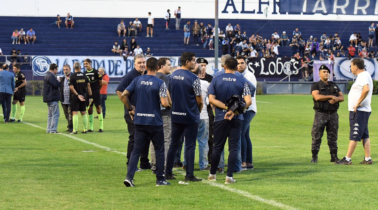 El árbitro Leandro Rey Hilfer, tras aguardar más de 20 minutos, decidió suspender el encuentro debido a que la policía de Mendoza no le ofrecía garantías para continuar por un grave choque entre dos fracciones de la barra de la "Lepra".