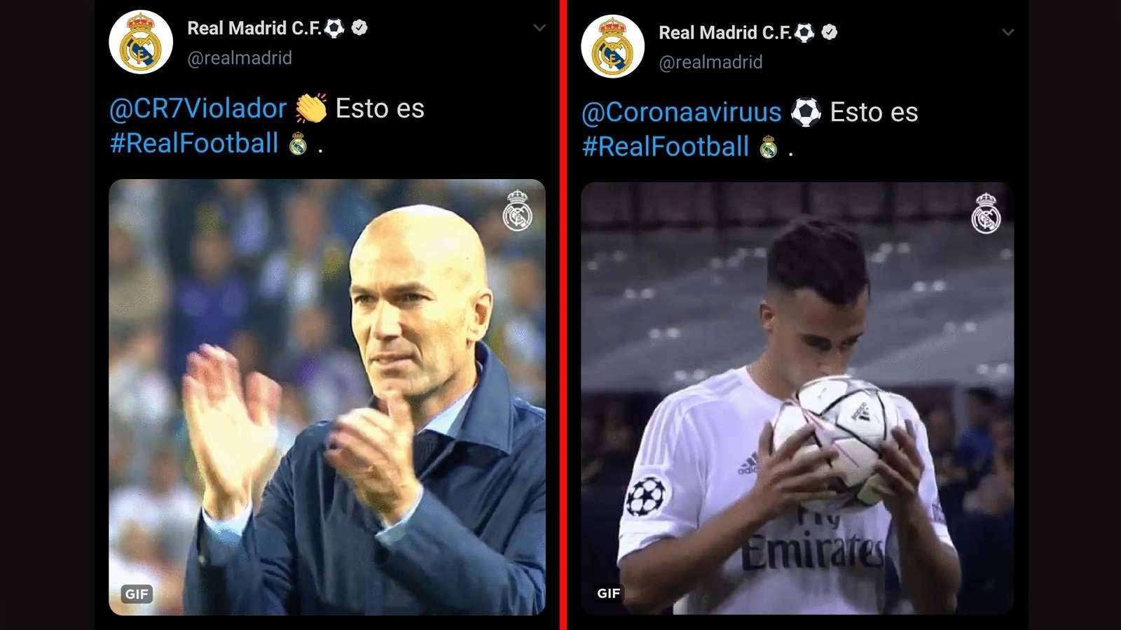 La polémica llegó poco tiempo después cuando el propio Real Madrid publicó un tweet en el que se mencionaba una cuenta llamada @CR7Violador, junto al emoji de las manos aplaudiendo y un gif del entrenador, Zinedine Zidane, también aplaudiendo. Otra publicación que se viralizó rápidamente mencionaba a la cuenta @Coronaaviruus acompañada con una gif de Lucas Vázquez besando una pelota de la Champions League.