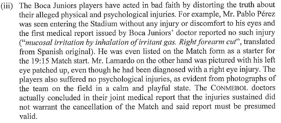 Luego, en este inciso hace foco en que las lesiones, como conclusión de los médicos de la Conmebol, no eran impedimento para que se dispute el partido. Los médicos de la Conmebol concluyeron en su informe médico conjunto que las lesiones sufridas no justificaron la cancelación del partido y dicho informe debe ser considerado válido", concluye.