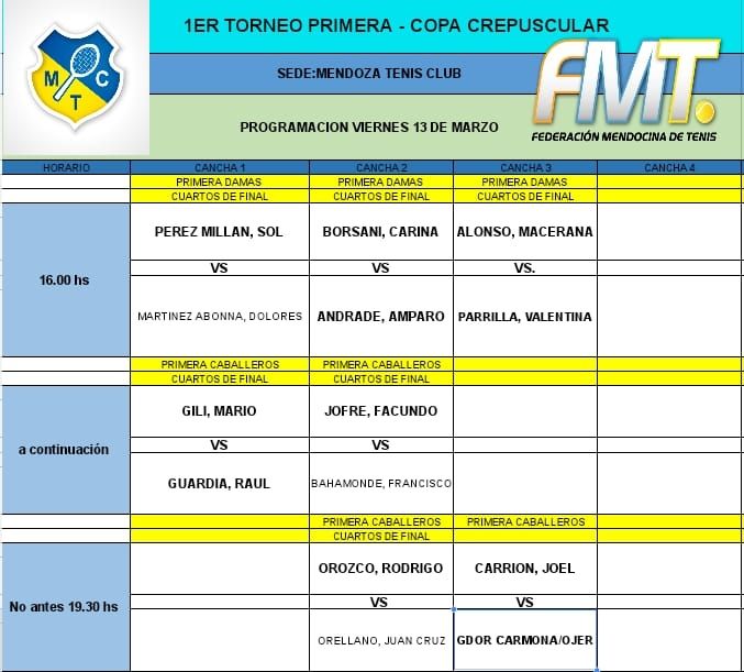 El Torneo Crepuscular del Mendoza Tenis Club sigue a todo ritmo tanto en los cuadros de Primera Categoría como en los de Menores, ya que se está jugando en forma simultanea el segundo Abierto, con una gran presencia de chicos de Mendoza y de San Juan.