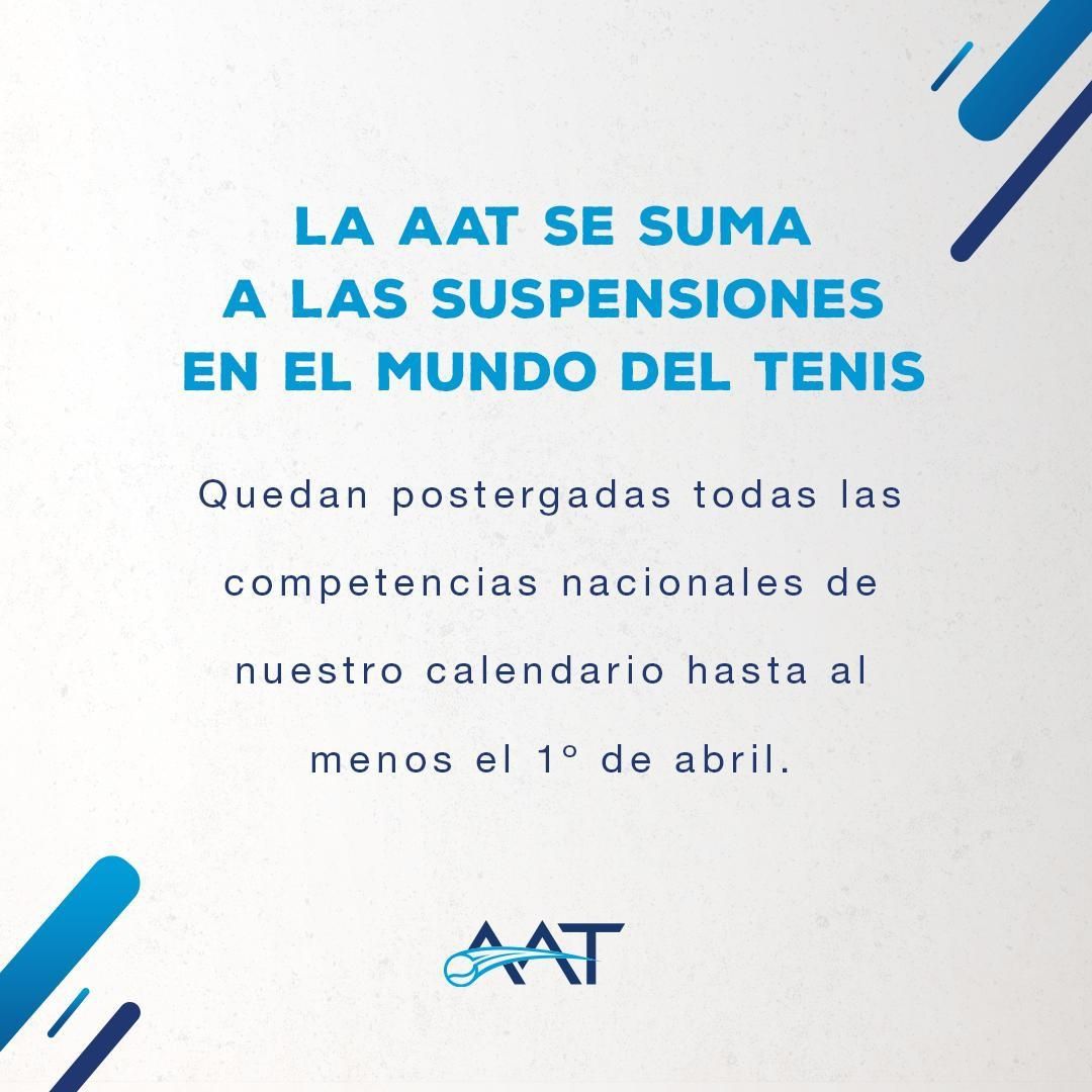 Este jueves, la Asociación Argentina de Tenis emitió un comunicado en el que informaba que se suma a las suspensiones en el mundo del tenis, quedando postergadas todas las competencias nacionales del calendario al menos hasta el 1 de abril. Esto afecta también a Mendoza ya que estaba previsto para las próximas semanas la disputa del Nacional de Menores en el Mendoza y del Vendimia en el Andino.