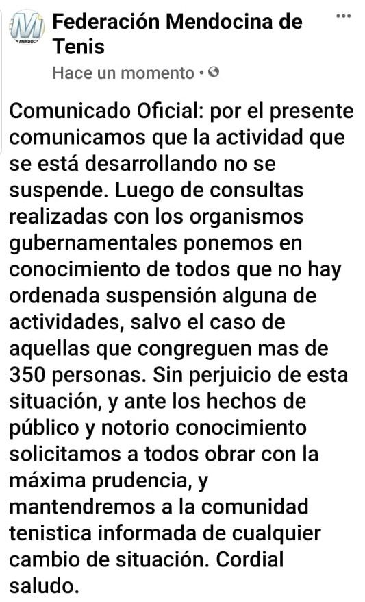 En tanto, la Federación Mendocina de Tenis informó también este jueves que la actividad que se está desarrollando no se suspende, pero llamó a los deportistas a obrar con máxima prudencia. De todas formas, según comentó el presidente de la FMT a este medio, se irá informando cualquier determinación que se tome.