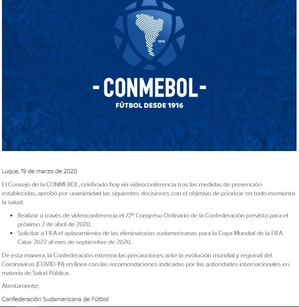 El organismo sudamericano hizo oficial la solicitud como medida de prevención por el Coronavirus en la región. El pasado 12 de marzo se había anunciado la suspensión de la primera fecha doble.