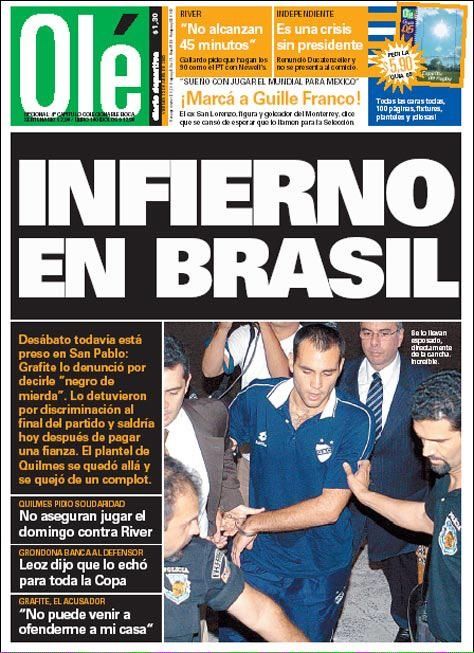 Pero Desábato fue detenido antes de bajar los vestuarios del Morumbí, en el campo mismo, por el comisario Oswaldo Gonzalvez, que había dado cauce a la denuncia formulada por Grafite: “el jugador argentino me llamó ‘negro’ y macaco”.