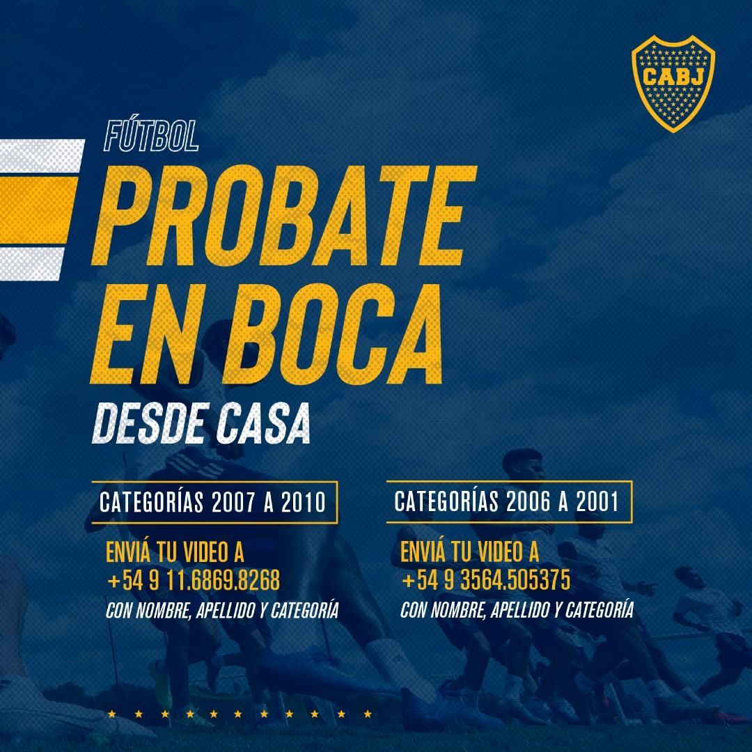 Un tuit publicado en la cuenta oficial de la entidad de la Ribera, con el título "Probate en Boca en casa", señala que "si tu sueño es jugar en Boca, mandanos tu mejor video y enviáselo a los captadores del club". Allí figuran dos números de WhatsApp para distintas categorías, una desde 2001 a 2006; y el otro de 2007 a 2010.