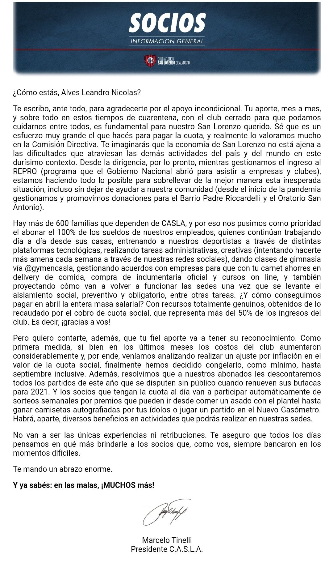 A su vez, en el mismo texto, que busca persuadir a los socios para que mantengan el pago al día, lo que representa la mitad del ingreso para el club, adelantó que todos los abonados que renueven sus butacas para el próximo campeonato tendrán "una bonificación por cada partido sin público en la cancha".