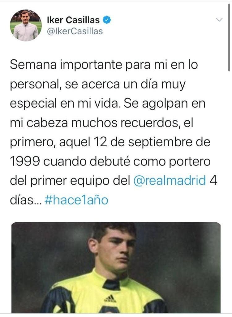Iker Casillas sorprendió en la tarde este lunes al publicar un enigmático mensaje en redes sociales que acabaría borrando pocos minutos después. El guardameta del Oporto escribió: "Semana importante para mí en lo personal, se acerca un día muy especial para mi vida. Se agolpan en mi cabeza muchos recuerdos, el primero aquel 12 de septiembre de 1999 cuando debuté como portero del primero equipo del Real Madrid. 4 días... #hace1año".