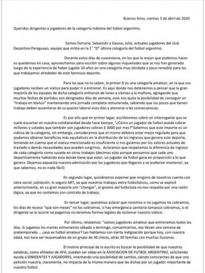 Julio Gauna y Sebastián Ferrario, ambos de la institución ‘guaraní’, hicieron público un texto en el que aclaran que los futbolistas de la divisional “apenas cobramos un viático para ir a entrenar”.