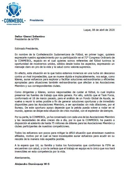 A través de una carta dirigida al presidente de la máxima entidad del fútbol mundial, el suizo Gianni Infantino, la Conmebol informa que dispuso un adelanto de 75 millones de dólares para las asociaciones y clubes sudamericanos pero remarca que "todos los esfuerzos son pocos para mitigar la difícil situación".