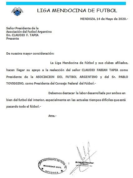 La Liga Mendocina de Fútbol es una de las federaciones que apoyan la reelección de Claudio Tapia en la presidencia de la Asociación del Fútbol Argentino, y a Pablo Toviggino como presidente del Consejo Federal, respectivamente, en el marco de la Asamblea que se realizará el martes 19 de mayo.