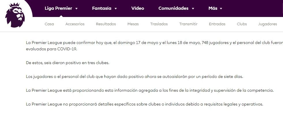 En un comunicado oficial que aparece en su página web, la Liga de Inglaterra de fútbol confirmó que "el domingo 17 de mayo y el lunes 18 de mayo, 748 jugadores y personal de los clubes fueron testeados para COVID-19. De esos tests, seis dieron positivo en tres clubes".