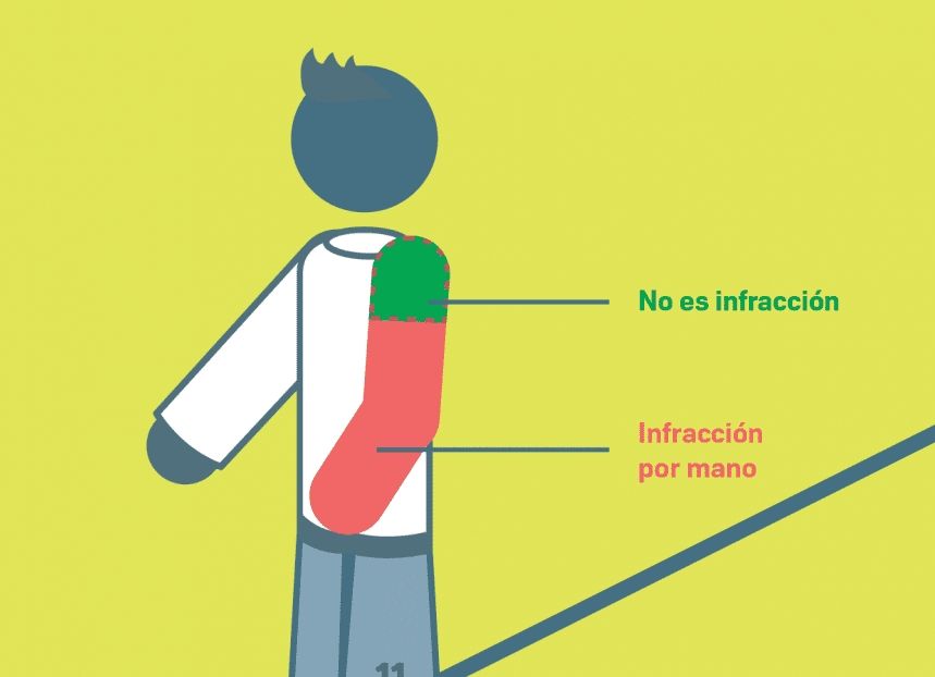 En cuanto a las manos, la FIFA mostró un gráfico para explicar dónde comienza la parte "sancionable", de modo que se dejen de cobrar los controles con la parte superior, donde articula con el hombro. Sobre las manos "accidentales", ahora determina que las manos no voluntarias se cobren sólo si derivan en forma inmediata en un gol o una situación clara de gol, pero no si después de la mano casual hay varios pases o la pelota le queda a un atacante sobre un costado y con su marcador de frente.