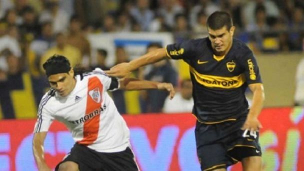 Muñoz marcando a Falcao en un Superclásico de verano en 2009.