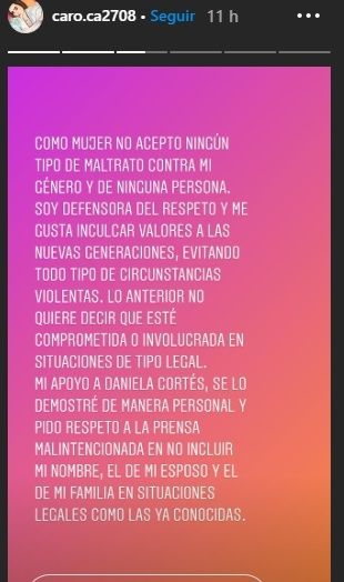 "Como mujer no acepto ningún tipo de maltrato contra mi género y de ninguna persona. Soy defensora del respeto y me gusta inculcar valores a las nuevas generaciones, evitando todo tipo de circunstancias violentas. Lo anterior no quiere decir que esté comprometida o involucrada en situaciones de tipo legal", aseguró Castaño en su cuenta de Instagram.